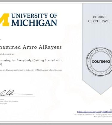 I completed the Python for Everybody course, where I learned the fundamentals of Python programming, including data structures, loops, functions, and working with files. This course helped me build a strong coding foundation, improve problem-solving skills, and apply Python to real-world projects like games and small applications.