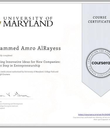 I am passionate about entrepreneurship and have completed a certificate course from Coursera to deepen my knowledge. Through this course, I learned how to turn innovative ideas into successful ventures, develop strategic thinking, and apply creative problem-solving to real-world business challenges.